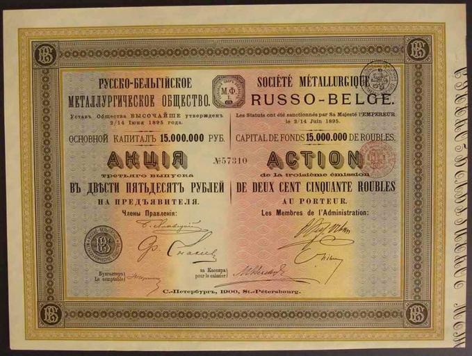 Keywords: 1900. Акция РБМО.jpg Акция Русско-Бельгийского металлу гического общества http //enr dn ua/ p 3500 1900 Русско-Бельгийское металлу гическое общество PD-RusEmpire Stock certificates of Russian-Belgian metallurgical society Files uploaded by Andrew Butko from various sources |