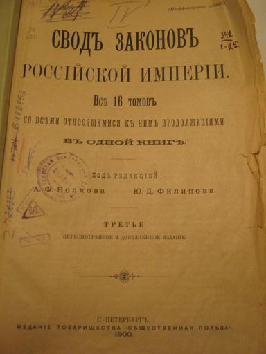 | Keywords: Свод законов (1900).JPG ru Свод законов Российской импе ии неофициальное издание 1900 http //www tounb ru/library/Upload/Images/exs_pcpi/ulozenie17 JPG А Ф Волков Ю Д Филипов other versions Custom license marker 2015 07 15 PD-old Uploaded with UploadWizard Law of the Russian Empire |