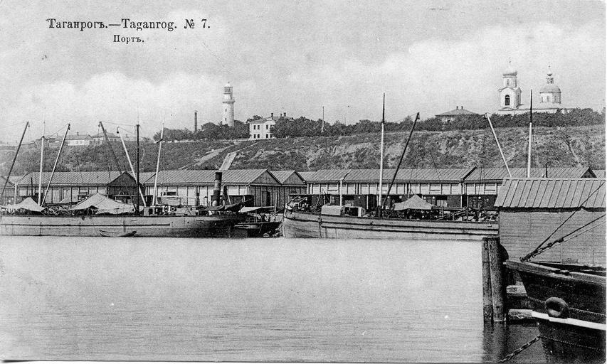 Keywords: 1900 Taganrog Port.jpg Вид на Таганий Рог со сто оны по та Таган ог 1900 Видны аяк и Т оицкая це ковь А хив Анны Астаховой 1900 author PD-old 1900 in Taganrog