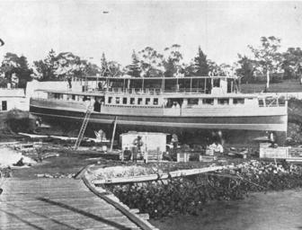 | Keywords: ship boart steam ferry hobart tasmania blackandwhite monochrome outdoor black and white LAUNCH OF THE DERWENT. At the Domain shipyards, at 8.40 am on Saturday, the hull of Messrs. O'May Bros' steamer, which has been built from special design for the passenger service between Bellerive and Hobart, was successfully launched. Notwithstanding the early hour, several hundred people were present at the ceremony , quite a large contingent had travelled by the 7 o'clock steamer from Bellerive, in order to be there, including the Hon A. Morrisby, M L C. The Derwent is what is known as the double-end type, and will have a four - bladed propeller both fore and aft. This class of vessel is quite new to Tasmania, though we have had experience of paddle steamers that could steam with equal facility either way. Messrs O'May Bros were prompted to build a double-end screw steamer, in order that the Bellerive ferry work can be conducted with much greater despatch than is possible with a vessel that can only steam the one way. It will never be necessary for the Derwent to turn round, and, moreover, the firm has had boiler and engines of sufficient power built to enable the Derwent maintaining a half-hourly service unaided, should it at any time be necessary. That, of course, is a splendid feature about the vessel, and will prove very advantageous in dealing with heavy holiday traffic. The largest passenger vessel on the river now is the Silver Crown, built in 1893, which is certificated for 293 adults. An idea of the size of the Derwent is given by the fact that she has been designed to carry between 500 and 600. It is anticipated that the new vessel will be ready for commission in about two months' time, and she will at once enter the Bellerive ferry service. Mr George O'May, the popular skipper of the Silver Crown, is to take command, and Mr H Roberts, of the Victory, is to be placed in charge of the engine department. Mr Ernest Watson O'May, master of the Victory, will be transferred to the Silver Crown. The Endeavour, in the Lindisfarne service, will be kept as a spare boat, and the Victory is to succeed her. It is not quite decided who will be the master. The Derwent was designed by Mr Walter Reeks, naval architect, Sydney, and built by Mr T Moore, of Launceston. It is interesting to note that though many notable craft, including large square rigged vessels, have been turned out at different times at the Domain shipyards, the Derwent is the first steamer to be built there since the paddle steamer Kangaroo, which carries on the vehicular and goods traffic between Bellerive and Hobart under Messrs O'May Bros. flag, and was launched from there 51 years ago. A feature about the Derwent is the strength of her build, and the first-class workmanship. Tasmanian timbers have been utilised for all the principal work, and none but the very best have been used. The vessel will have the distinction of having greater beam than any of the passenger steamers at present on the river. The chief dimensions are -Length, 110ft, beam, 26ft 6in , and depth, 9ft. The keel was laid November last. It is not intended to give a detailed description of the Derwent just now, as that can be better done when the vessel has been finished. We merely remark that the steamer has very nice lines, and, judging from an inspection of the hull and the plans of the deck arrangements, the vessel will be very superior, and a decided acquisition to the river fleet. Every attention is to be given to the comfort of passengers, and we feel sure that they will have nothing but praise for the new steamer. As an element of safety in case of accident, the hull has been subdivided into several water tight compartments. The launching of the vessel was successfully performed. The length of the way was 160ft. As the last restraints were knocked away and the vessel commenced to move, Miss Alice O'May named the steamer Derwent amidst great cheering, the christening being done in accordance with the long-established custom of breaking a bottle of wine over the bows. The hull was decorated with laurel wreaths, and was dressed with the firm's house flags and the Commonwealth flag. Steamers of the firm in the vicinity gave seven blasts as the Derwent took the water, and the passengers on the Endeavour, which passed just after the launch, gave ringing cheers. The Derwent was towed to Bellerive to be finished. Boiler and engines will probably be put into the vessel this week. On Saturday evening, at the residence of Mr James O'May, senior partner of the firm, Messrs O'May Bros entertained the contractors and builders at dinner. W Williamson photo LAUNCH OF THE DERWENT. At the Domain shipyards, at 8.40 am on Saturday, the hull of Messrs. O'May Bros' steamer, which has been built from special design for the passenger service between Bellerive and Hobart, was successfully launched. Notwithstanding the early hour, several hundred people were present at the ceremony , quite a large contingent had travelled by the 7 o'clock steamer from Bellerive, in order to be there, including the Hon A. Morrisby, M L C. The Derwent is what is known as the double-end type, and will have a four - bladed propeller both fore and aft. This class of vessel is quite new to Tasmania, though we have had experience of paddle steamers that could steam with equal facility either way. Messrs O'May Bros were prompted to build a double-end screw steamer, in order that the Bellerive ferry work can be conducted with much greater despatch than is possible with a vessel that can only steam the one way. It will never be necessary for the Derwent to turn round, and, moreover, the firm has had boiler and engines of sufficient power built to enable the Derwent maintaining a half-hourly service unaided, should it at any time be necessary. That, of course, is a splendid feature about the vessel, and will prove very advantageous in dealing with heavy holiday traffic. The largest passenger vessel o