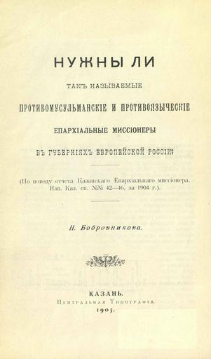 Нужны ли так называемые противомусульманские и противоязыческие епархиальные миссионеры в губерниях Европейской России? : (По поводу отчета Казан. епарх. миссионера. Изв. Каз. еп. N 42-46, за 1904 г.) / [Соч.] Н. Бобровникова. - Казань : Центр. тип., 1905. - 18 с.; 24.