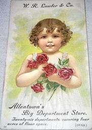 | Keywords: 1905 - W R Lawfer & Company - Trade Card.jpg en W R Lawfer Company - Trade Card W R Lawfer Co was formed in 1905 In 1910 Lawfer's was replaced by Zollinger-Harned Company The local Harned and Vollmer family ran the company as Allentown's third major downtown Department store The Zollinger half of Zollinger-Harned had no connection with Allentown as William R Zollinger 1855-28 July 1922 was an inventor and department store investor that lived in Sandusky Ohio and operated the Zollinger Department store 1900 there 1905 Creator Unknown Creator Unknown other versions PD-old-70-1923 Zollinger-Harned Department Store Trade cards of Allentown Pennsylvania 1900s in Allentown Pennsylvania |