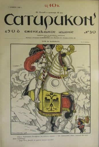 | Keywords: 1908-11-01 30 Satirikon p.1s.jpg И Билибин Тучи на Балканах 1908 с 1 А Яковлев Рисунки с 2 5 исс Рисунок с 3 А Юнге Вильгельм и Бюлов с 8 // А Т Аве ченко ед Г Ко нфельд изд Сати икон Вып 30 СПб ; Конто а и Редакция С -Пете бу г евский 9 Телефон 241-29; Т-во Р Голике и А Вильбо г СПб Звениго одская 11; 10 коп в оскве и п овинции 12 коп ; 1 нояб я 1908 http //www pv-gallery ru/search/1908-11-01_30_Satirikon_p 1s jpg 1908 Ivan Bilibin Magazine covers by Ivan Bilibin Files uploaded by Shakko from various sources PD-old Satirikon 1908 |