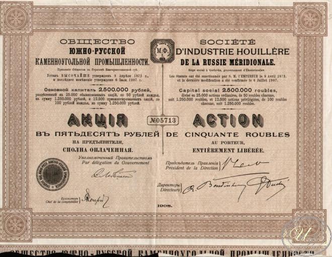 | View Original: | 1909. Акция. Общество Южно-русской каменноугольной промышленностив 50 рублей.jpg (700x543) | |||