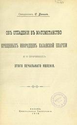 Об отпадении в магометанство крещеных инородцев Казанской епархии и о причинах этого печального явления / Свящ. С. Багин. - Казань : Центр. тип., 1910. - 35 с.; 23.