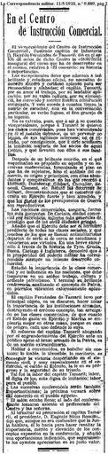 | Keywords: 1910-Centro-Instruccion-Comercial-conferencia.jpg  es Centro de Instruccion Comercial - Conferencia inaugural del vicepresidente del Centro capitan de Infanteria D Ricardo Fernandez de Tamarit con intervencion final del presidente de dicho Centro D Eugenio Sainz Romillo 1910-05-11 La Correspondencia militar 11 5 1910 pag 2 author other versions La Correspondencia militar 11 5 1910 pag 2 En el Centro de Instruccion Comercial El vicepresidente del Centro de Instruccion Comercial ilustrado capitan de Infanteria D Ricardo Fernandez de Tamarit diò en el salon de actos de dicho Centro la conferencia inaugural del curso que ha de desarrollar en el mismo relativo a El comercio su historia è importancia Las excepionales dotes que adornan a tan brillante y estudioso oficial no necesitan de nuestro sincero y cariñoso aplauso para ser reconocidas y alabadas; el capitan Tamarit por su amor al trabajo por su laudable aplicacion por su vasta cultura por su elocuencia ha merecido y merece nuestra admiracion entusiasta Y esto sucede a cuantos tienen la suerte de escuchar aun en la conversacion particular su verbo focoso el fino gracejo de su ingenio No lejano de sus legitimos intereses; no es extraño por consiguente que a oirle acudiesen la inmensa mayoria de los socios de aquel Centro y que llevasen con ellos a sus familias Despues de un brillante exordio en el que exquematizò su proposito en aquella y en sucesivas conferencias formulando el plan en que ha de sujetarse hizo el analisis del comercio su origen y principios con citas abundantes y comparativas en las que recordò a Hoff ¦ Duesberzg Gilbart; Chevalier Seneuil Clement etc Refutò las doctrinas de Gilbart demostrandonos que el comercio necesita un Ejercito fuerte y bien atendido y que los gastos de los presupuestos de Guerra son reproductivos Las naciones comerciales asegura fueron las mas guerreras De Corinto ciudad comercial por excelencia salieron mas generales de prestigio que de las otras ciudades griegas Añadiò que el ejercito debe ser el hermano predilecto de todas clases socales y que muchos de los que se llaman antimilistaristas dejaron de serlo si de cerca se estudiasen y conocieran sus virtudes En una breve excursion a traves de la historia de Tyro Grecia Roma Cartago è Inglaterra demonstrò que a la prosperidad del poderio militar ha correspondido siempre un intenso desarollo comercial Estudiò la importancia de la clase comercial y su influencia en las naciones que debe inspirarse en un asiduo trabajo cultura y ardiente patriotismo Y terminò su brillante conferencia analizando el concepto de Patria en parrafos vibrantes calurosamente aplaudidos EEl capitan Fernandez de Tamarit tuvo por principal objeto en su discurso hacer notar la importancia de las instituciones armadas destuyendo el erroneo concepto tan arraigado en las clases comerciales de que cuanto el Estado gasta en Ejercito y Marina se emplearia mejor en otras cosas porque en caso de peligro cada uno defiende lo suyo El esfuerzo del capitan Tamarit abogando por el engrandecimiento del Ejercito ante un publico ajeno al brazo armado de la Patria es de un merito extraordinario Hablar a convencidos es batallar sin enemigo; lo loable lo plausible lo meritorio es conseguir la victoria despertando en el elemento civil y muy especialmente en el comercial el cariño al Ejercito la fe en su progreso y la seguridad de su triunfo Tal fue la labor del capitan Tamarit; labor el digna de los mas digna de imitacion; labor para el pueblo Las sucesivas conferencias seran tambien importantisimas; la proxima versarà sobre El comerio en el pueblo egipcio El salon estaba lleno; al lado del conferenciante tomaron asiento el profesorado del Centro y las señoras Al terminar su peroracion el capitan Tamarit el presidente Eugenio Sainz Romillo dijo que aunque no era costumbre de la Junta hablara el lo hacia para hacer resaltar la importancia merito y elevacion de los conceptos expuestos en la conferencia y añadiò una oportunisima indicacion que seguramente los oyentes apreciarian en su justo valor PD-old Uploaded with UploadWizard Centro de Instruccion Comercial Madrid La Correspondencia militar Madrid 1910 in Madrid Ricardo Fernandez de Tamarit |