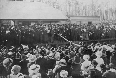 | Keywords: train railway station tasmania people blackandwhite monochrome crowd outdoor black and white Governor Sir Harry Barron cuts the ribbon at Branxholm to open the extension from Scottsdale. Spurling photo Governor Sir Harry Barron cuts the ribbon at Branxholm to open the extension from Scottsdale. Spurling photo |