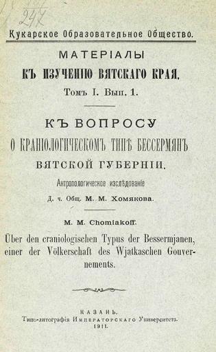 К вопросу о краниологическом типе бессермян Вятской губернии : Антропол. исслед. д. ч. О[-ва] М.М. Хомякова. - Казань : типо-лит. Имп. ун-та, 1911. - 12 с.; 24. - (Кукарское образовательное общество. Материалы к изучению Вятского края; Т. 1. Вып. 1).