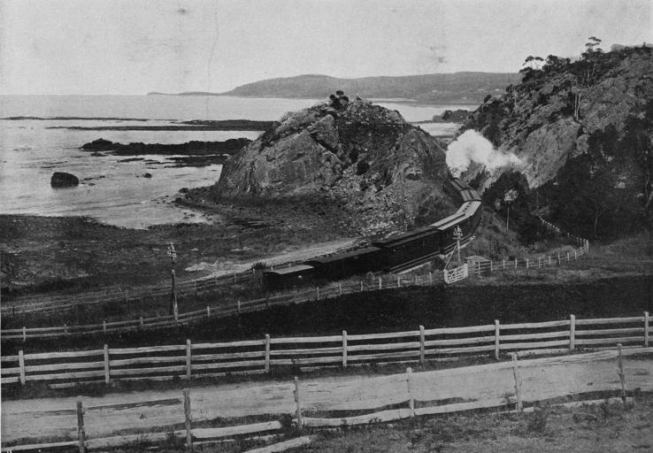 | Keywords: tasmania blackandwhite monochrome outdoor black and white An A class 4-4-0 heads an eastbound passenger train at Three Sisters between Penguin and Ulverstone. M N Nichols photo An A class 4-4-0 heads an eastbound passenger train at Three Sisters between Penguin and Ulverstone. M N Nichols photo |