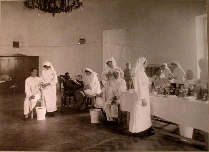 | View Original: | 1914. 10. Медицинские сестры за перевязкой раненых в перевязочной лазарета, устроенного в помещении Дворянского клуба.jpg (2288x1672) | |||
