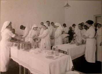 | View Original: | 1914. 14. Медицинские сестры за перевязкой раненых в перевязочной лазарета св.Татьяны, устроенного в Университетской типографии.jpg (2368x1720) | |||