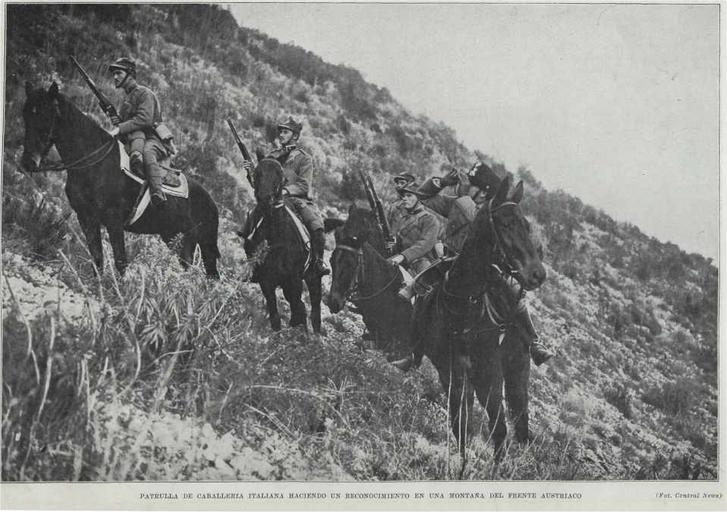 | Keywords: 1914-soldati-italiani-in-ricognizione.jpg  it Pattuglia di cavalleria italiana in ricognizione sul fronte austriaco durante la prima Guerra mondiale 1914 La Guerra ilustrada N º 51 Fot Central News other versions PD-old Uploaded with UploadWizard Photographs of World War I La Guerra Ilustrada Italy in World War I Central News Photo Service |