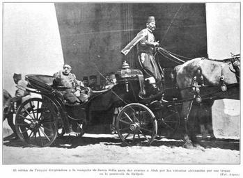 | Keywords: 1914-Sultan-Mehmed-V.jpg it Il sultano turco Mehmed V si reca in carrozza alla mezquita di Santa Sofia a Istanbul per rendere grazie a Allah per la vittoria conseguita dalle sue truppe a Gallipoli 1914 c La Guerra ilustrada N º 31 página 17 Fot Argus other versions PD-old Uploaded with UploadWizard Mehmed V La Guerra Ilustrada portraits |