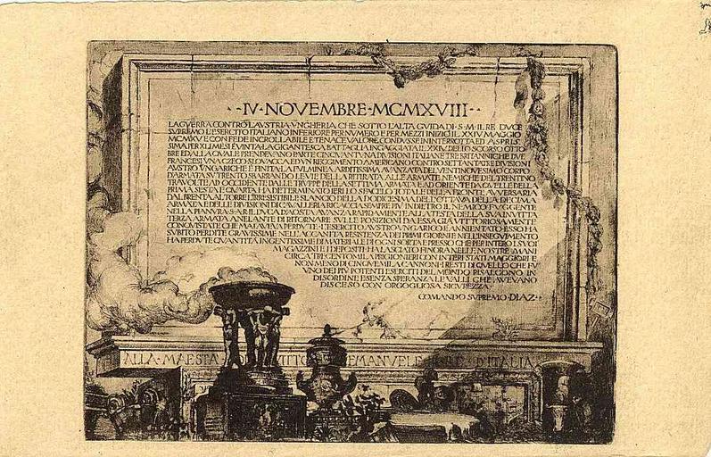 | Keywords: 1915-1918-bollettino-della-Vittoria-4-novembre-1918.jpg it Cartolina riproducente il Bollettino della Vittoria del 4 novembre 1918 - da un'acquaforte di G Greppi - pro monumento per i Caduti - timbro della Associazione Nazionale dei Combattenti Collezione cartoline Albertomos Albertomos 1918 testo del Bollettino della Vittoria ImageNote 1 242 130 605 346 1093 702 2 4 novembre 1918 Comando Supremo La guerra contro l'Austria Ungheria che sotto l'alta guida di S M il Re duce supremo l'Esercito Italiano inferiore per numero e per mezzi iniziò il 24 maggio 1915 e con fede incrollabile e tenace valore condusse ininterrotta ed asprissima per 41 mesi è vinta La gigantesca battaglia ingaggiata il 24 dello scorso ottobre ed alla quale prendevano parte 51 divisioni italiane 3 britanniche 2 francesi una Czeco Slovacca ed un reggimento americano contro 73 divisioni Austro Ungariche è finita La fulminea arditissima avanzata del 29 Corpo d'Armata su Trento sbarrando le vie della ritirata alle armate nemiche del Trentino travolte ad occidente dalle truppe della 7 armata e ad oriente da quelle della 1 6 e 4 ha determinato ieri lo sfacelo totale del fronte avversario Dal Brenta al Torre l'irresistibile slancio della 12 della 8 della 10 armata e delle divisioni di cavalleria ricaccia sempre più indietro il nemico fuggente Nella pianura S A R il Duca d'Aosta avanza rapidamente alla testa della sua invitta 3 armata anelante di ritornare sulle posizioni da essa già vittoriosamente conquistate L'Esercito Austro Ungarico è annientato esso ha subito perdite gravissime nell'accanita resistenza dei primi giorni e nell'inseguimento ha perduto quantità ingentissime di materiali di ogni sorta e pressoche per intero i suoi magazzini e i depositi Ha lasciato finora nelle nostre mani circa 300 000 prigionieri con interi stati maggiori e non meno di 5 000 cannoni I resti di quello che fu uno dei più potenti eserciti del mondo risalgono in disordine e senza speranza le valli che avevano disceso con orgogliosa sicurezza Diaz ImageNoteEnd 1 ImageNote 2 184 534 645 40 1093 702 2 ALLA MAESTA' DI VITTORIO EMANUELE III RE D'ITALIA ImageNoteEnd 2 World War I postcards of Italy Bollettino della Vittoria |