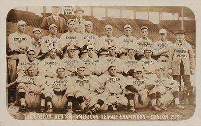| Keywords: 1915 Boston Red Sox with Rookie Babe Ruth.jpg 1915 Boston Red Sox with Rookie Babe Ruth This real photo postcard greeted hometown fans at Braves Field for the third and fourth games of the World Series the National League park borrowed due to a seating capacity superior to the newly-constructed Fenway Park Text at the bottom edge of the team image suggests production prior to the team's World Championship realization reading The Boston Red Sox--American League Champions--Season 1915 Each Red Sox player is pictured in the classic team shot and identified with surname and position in bold printed text We find Ruth at center of the back row http //sports ha com/itm/baseball/1915-boston-red-sox-with-rookie-babe-ruth-real-photo-postcard-psa-ex-55/a/7130-80106 s Heeritage Auctions 1915 unattributed PD-old 1915 postcards of the United States 1915 in baseball 1915 photographs 1915 in Boston Babe Ruth Boston Red Sox seasons |