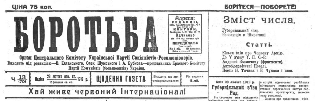 Keywords: Боротьба 1919-02-23.jpg Газета «Бо отьба» за 23 лютого 1919 оку де впе ше були над уковані автобіог афічні новели Анд ія Заливчого http //81412 livejournal com/56913 html 1919-02-23 Scan by AMY <span class signature-talk ></span> PD-Art Andrii Zalyvchyi |