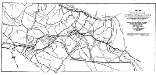 | Keywords: 1920 Philadelphia and Columbia.jpg s of these locations as they existed in 1920 may no longer be accurate A South slope still traceable of embankment on curve leading from Columbia Bridge east of Junction Railway toward the Inclined Plane B On east side of Junction Railway looking west toward that Railway - End of square stringer or tie with long round iron ball bent to a semicircle - Square stone block - These two perhaps in place C Stone tie and three pairs of square stone blocks at south corner of row of dwellings CE Line of inclined plane well marked by excavation and embankment filled with undergrowth but without notable relics Park trolley line occupies stretch D-E F Remains of double track on curve just south of Park trolley track south of Junction station East track on stone stringers; west track on square stone blocks Detached pair of square stone blocks in place near by indicating curve to the right Stringers in vicinity out of place Long grass cut and earth covering removed by order of Mr Alan Carson Chief Engineer to Park Commission G South side of Midvale Ave opposite Methodist Home for the Aged Double track as in F but on tangent HJ From H to J the Columbia R R line followed the present line of Conshohocken State Road now Conshohocken Ave The stone blocks were thrown to the south side of the new highway where they still remain in a line marked by trees and shrubbery JK From J to K the Columbia R R line kept to the west of Conshohocken Ave in part of this distance being directly over the present tracks of the Schuylkill Division of the Pennsylvania R R K East and west slopes of side-hill cuts on east side of excavation of Schuylkill Division Pennsylvania R R and south of highway bridge carrying Montgomery Ave over said division Blue print furnished by Pennsylvania R R Company engineer office shows center line of Columbia R R crossing center line of Schuylkill Division Pennsylvania R R in axis of said highway bridge and near the middle of its length KL From K the Columbia R R line seems to have followed the present line of Bala Ave to about where it now crosses Bryn Mawr Ave Thence it followed a tangent to a point in the rear of the present house of the Union Fire Association Thence it curved to the right passing under the old Ford Road which crossed over the R R on Bowman's Bridge This curve brought the R R line to a tangent at a point L where the line of the south side of Montgomery Ave then called Old Lancaster Road produced reaches what is still called Old Lancaster Road At the N E corner of Ford Road and Parson's Ave Mr J S Parsons has built a corner post containing several of the old square stone R R blocks The changes in roads at Merionville seem to have been roughly as follows - Before the R R abc Old Lancaster Road adef Ford Road But between d and e Ford Road was kinked to dbe in order to make it cross the R R nearly at right angles and de was abandoned the line of Ford Road after the building of the R R thus becoming adbef The portion of db of Ford Road now coincides with the line of Levering Mill Road gdb When Montgomery Avenue was created it took abc from the Old Lancaster Road but later bf was called Mongomery Avenue and bc again became Old Lancaster Road cd is now called Ford Road bc Old Lancaster Road abef Montgomery Ave and gdb Levering Mill Road LO From L to O the Columbia R R line followed the south side of Old Lancaster Road now Montgomery Avenue At M just east of Thourun's Lane which crosses a small run on a bridge of three arches is the south face of an arched stone culvert At N is the Federal Spring Many of the old stone R R blocks are here built into the retaining wall on the south side of Montgomery Ave Beyond O the R R line curved gently to the left P At P the R R line passed over the site of a frame stable building At the SW corver of this stable the top course of a box culvert is seen PQ From P to Q the line easily traceable by pairs of tall trees and by underbrush on the old low embankment follows the south property line of John Albrecht's triangular lot QR Between Q and R the line has been entirely obliterated by the building operations which produced the newer part of Narberth In general the R R line crossed the lines of the present streets at angles of about 45 degrees to its crossing with the present Essex Ave just north of the Narberth Public School Beyond this it probably followed nearly the curve of Essex Ave Stone blocks out of place are seen at the corners of Hamden and Woodbine Aves Woodbine and Narberth Aves and Narberth and Price Aves RS Between R and S remains of a low R R embankment are seen with remains of a box culvert where the line crossed a small run T In a driveway at T are seen well preserved and well exposed 3 pairs of the square stone blocks U At U the R R crossed the Old Lancaster Road now Montgomery Ave which was bent for the purpose crossing the R R at right angles The resulting kink has been removed From U to the east side of Montgomery Ave the line is easily traced by old trees underbrush and the remains of a shallow cut VW From V to a point just east of the Lower Merion High School at W the R R line lies a little to the northward of Montgomery Ave then Old Lancaster Road It was here mostly in shallow excavation where many square stone blocks are still in place The line is easily recognizable from Montgomery Ave by the double line of trees which its presence preserved from destruction WX Between W and X the R R line described a curve of some 75 degrees to the right ending at about the present Thompson Avenue a little south of the east end of Coulter Ave In the yard of Mr Swartz at X is a stone block with chair mark apparently nearly in place From X the R R line lay a little to the south of the present Coulter Avenue probably meeting it and the present main line of the Pennsylvania Railroad where the two now intersect at Y The portion of the Philadelphia Columbia R R from A to Broad and Vine Streets was sold b