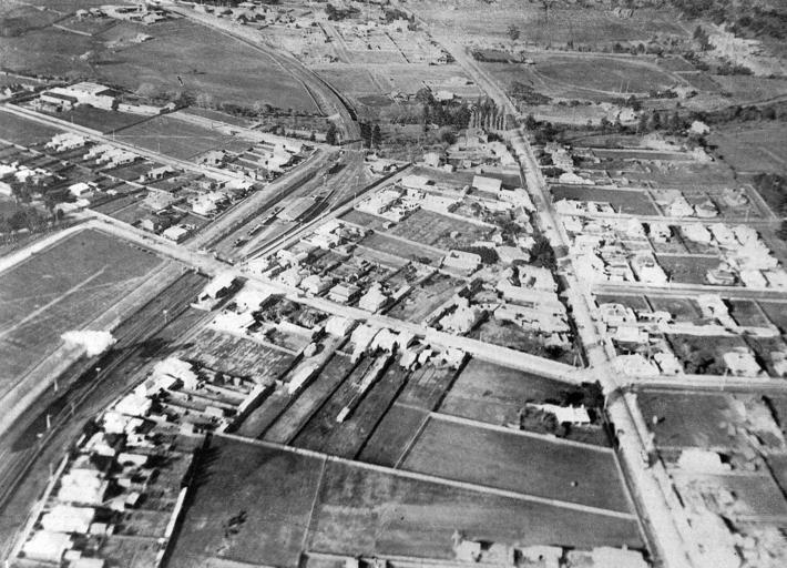 Keywords: tasmania blackandwhite monochrome aerial road outdoor building structure architecture building infrastructure black and white Aerial of Moonah looking south with the railway station to the left centre. H J King photo Aerial of Moonah looking south with the railway station to the left centre. H J King photo |