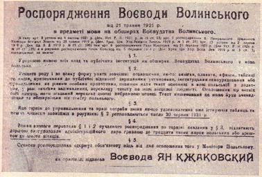 Keywords: 1921 Decree on Polish as state language in Volyn Voyvodeship.jpg Decree of Voivod of Wołyń Voivodeship Jan Krzakowski On language in the Volhynian Voyevodstvo Ukrainian В п едметі мови на обши ах Воєвудзтва Волинського establishing Polish as the official language in accordance with the 1921 Treaty of Riga ending the Polish Soviet War in which the frontiers between Poland and the Soviet Russia had been defined Written in Ukrainian Pаспо яжение 1921 польского воеводы Волынского В п едмете мовы на обши ах Воевудзства Волынського о полонизации бывшей губе нии Российской Импе ии <small>Качество изоб ажения полностью соответствует изоб ажению документа в книге </small> Розпо ядження 1921 польського воєводи Волинського В п едметі мови на обши ах Воєвудзтва Волинського п о полонізацію Волинського воєводства Це стало можливим внаслідок того що ці землі відійшли до Д угої Речі Посполитої Це сталося після Ризького ми у 1921 оку який озділив Ук аїну між Польщею та Радянським Союзом <small>Якість зоб аження повністю відповідає зоб аженню документа у книзі </small> History of Ukrainian SSR Kyiv volume 2 1967 Исто ия УРСР Киев том 2 1967 Істо ія УРСР Київ том 2 1967 1921-05-21 Wołyń Voivod Jan Krzakowski Jan Kzhakovsky Воевода Волынский Ян Кжаковский Воєвода Волинський Ян Кжаковский PD-old Early Modern period Polish language Belarusian language Ukrainian language Geopolitics Political geography Volhynia