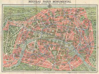 | Keywords: 1928 A. Leconte Map of Paris France w- Monuments - Geographicus - ParisMonumental-laconte-1928.jpg This is an extremely attractive c 1928 tourist pocket map of Paris France Covers the old walled city of Paris and the immediate vicinity Important buildings are shown in profile including the Eiffel Tower the Arc de Triomphe Sacre-Coeur the Pantheon and others Shows both the train and Metro lines throughout the city This map was issued in various editions from roughly 1900 to 1937 Though most examples are undated we can assign an approximate date due to the development of the Metro system and the map's overall style and construction Attached to original red paper booklet which is itself split at spine A similar map of the greater Paris environs appears on the verso Engraved by L Poulmarie and printed by Gaston Maillet Published by A Leconte of 38 Rue St Croix de la Bretonnerie Paris 1928 undated Size in 27 21 object history credit line accession number ParisMonumental-laconte-1928 Leconte A <i>Plan Monumental Paris Environs Itineraire Metropolitan</i> 1928 Geographicus-source PD-art Maps of Paris in the 20th century 20th-century maps of Paris Maps of landmarks in Paris 1928 maps 1928 in Paris |