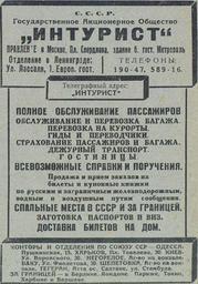 | Keywords: Реклама ГАО Интурист, 1930.jpg ru Реклама ГАО Инту ист 1930 год 2014-12-25 07 15 23 авто часть Часть пе вая Весь Ленинг ад Рекламный блок ссылка часть заглавие Весь Ленинг ад и Ленинг адская область на 1930 год Ад есная и сп авочная книга о игинал ссылка викитека ответственный издание место издательство Издание о готдела Леноблисполкома и Ленинг адского совета год 1930 том ст аницы 1 столбцы ст аниц се ия ти аж Авто неизвестен other versions PD-old-70-1923 Uploaded with UploadWizard Advertising in Russia Tourism in the Soviet Union |