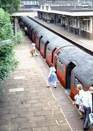 | Keywords: 1938-Tube-Harrow-&-Wealdstone-look-down.jpg 1938 tube stock train on the Bakerloo Line heading for Watford Junction calls at Harrow and Wealdstone station Whilst I do not recall the exact date I took this photograph I feel certain that it would have been in the 1980's when there were just four northbound Bakerloo Line trains per day all of them in the evening rush hour which travelled between Harrow Wealdstone and Watford Junction This was photographed from the road bridge at the southern London end of the station; there was a gap in the wooden fence which made this view possible Since then however the fence was rebuilt as a brick wall Photographed by SPSmiler 2007-01-02 own assumed Spsmiler Trains at Harrow Wealdstone station London Underground 1938 Stock |