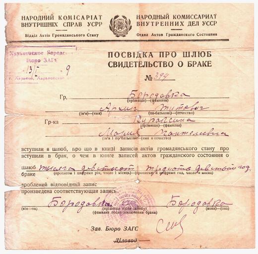 | Keywords: 1939 Свидетельство о браке Харьков.jpg КВД УССР Ха ьковское Го одское Бю о ЗАГС Свидетельство о б аке scanned official paper doc by user Vizu 1939-01-13 а одный комисса иат внут енних дел УССР PD-RU-exempt documents USSR PD-UA-exempt documents UkrSSR PD-old-70 Documents of Kharkiv Documents of Ukrainian SSR Documents of NKVD 1939 in Kharkiv Marriage certificates of the Soviet Union | ||||