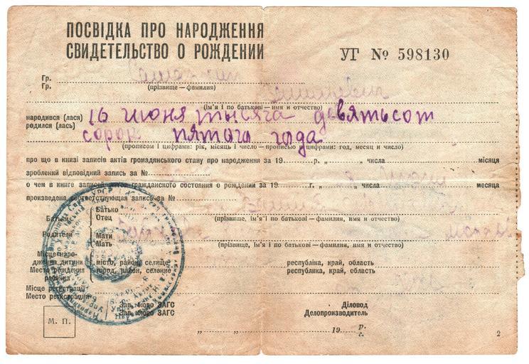 | Keywords: 1945 Свидетельство о рождении Б.jpg en Ukrainian Soviet socialist Republic ru Свидетельство о ождении в го оде Ха ькове КВД СССР на усском и ук аинском языках 1940 печать 1945 заполнено от уки Внут енняя сто она 1940 print own scan doc NKVD USSR Official documents The public domain paragraph C <gallery>File 1945 Свидетельство о ождении А jpg </gallery> PD-UA-exempt documents UkrSSR PD-RU-exempt documents USSR PD-old-70 1940 print PD-ineligible text Documents of Kharkiv Documents of NKVD Documents of Ukrainian SSR Unidentified year in Kharkiv Birth certificates of the Soviet Union |