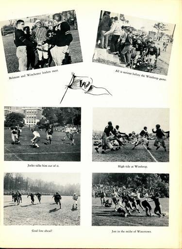 Keywords: Football photos, drawing of pennant with "W", Aberjona yearbook 1952, Winchester, MA winchesterhighschool aberjonayearbook1952