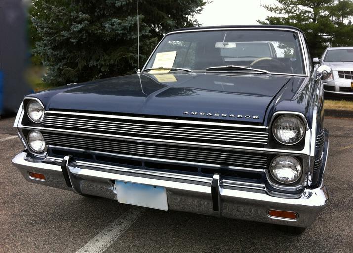 Keywords: 1966 AMC Ambassador 990 4-sp convertible AACA Iowa f.jpg 42 028833333333 -91 651833333333 en 1966 AMC Ambassador 990 convertible finished in blue - front view of full width grille A full-sized automobile built by American Motors Corporation AMC in Kenosha Wisconsin This is an all original one-owner car that was special ordered by them Among the features on this car are its 327 cu in 5 4 L 4--barrel carb V8 engine with a 4-speed manual transmission center console mounted shifter with black bucket seats as well as an AM/FM radio and an aftermarket 8-track stereo player Picture taken at the 2012 Antique Automobile Club of America AACA Central Spring meet in Cedar Rapids Iowa USA 2012-06-23 14 31 37 own CZmarlin ” Christopher Ziemnowicz releases all rights but a photo credit would be appreciated if this image is used anywhere other than Wikipedia Please leave a note at Wikipedia http //en wikipedia org/w/index php title User_talk CZmarlin action edit section new here Thank you thumb left Left side front view thumb center Right rear view thumb left Rear view thumb center Right side view thumb left Front right side view thumb center Interior view thumb left Driver's compartment thumb center Interior view thumb left Left side of engine thumb center Right side of engine thumb left Another front view thumb center Headlamp detail thumb left Model name and wheel detail thumb center Another right front view thumb left upright Tail lamp detail cc-zero AMC Ambassador Uploaded with UploadWizard Automobile grills |