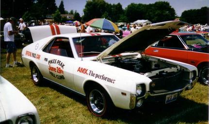 | Keywords: 1969 AMC AMX Pikes Peak car at Kenosha show.jpg en 1969 AMX by AMC American Motors Corporation This is one of the official pace cars used in the Pikes Peak race on 29 June 1969 There were 12 perhaps only 10 according to some sources of these AMX Pace and Courtesy cars that were used to practice by racers the week prior to the race up the mountain All had the 390 Go-Pac option and were finished in white with red stripes and red interiors Picture was taken at the AMC show in Kenosha Wisconsin own 2010-07-03 CZmarlin ” Christopher Ziemnowicz releases all rights but a photo credit would be appreciated if this image is used anywhere other than Wikipedia Please leave a note at Wikipedia http //en wikipedia org/w/index php title User_talk CZmarlin action edit section new here Thank you en I the copyright holder of this work hereby release it into the public domain This applies worldwide AMC AMX 1969 AMC automobiles AMC pace cars Pikes Peak International Hill Climb automobiles |
