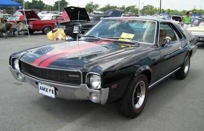 | Keywords: 1969 AMX black with red stripes VA f.jpg en 1969 AMX by American Motors Corporation AMC A two-seat GT-type sports coupe Finished in Classic Black with red stripes This car has the optional 390 Go Package that included the 390 cu in 6 4 L 315 hp 235 kW V8 engine racing stripes over the hood roof and trunk power disk brakes front Twin-Grip differential heavy-duty cooling including a seven-blade flex fan and shroud as well as a 140-mph 225-km/h speedometer and styled steel Magnum 500 wheels with bright trim rings The high-performance E70x14 red stripe wide-oval tires are correct factory standard equipment for this year own 2010-06-19 CZmarlin ” Christopher Ziemnowicz releases all rights but a photo credit would be appreciated if this image is used anywhere other than Wikipedia Please leave a note at Wikipedia http //en wikipedia org/w/index php title User_talk CZmarlin action edit section new here Thank you en I the copyright holder of this work hereby release it into the public domain This applies worldwide thumb left View of the rear thumb center View of the side thumb left View of the red racing stripes AMC AMX 1969 AMC automobiles Black coupes |