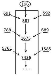 | Keywords: 196 lychrel thread.jpg en This diagram describes the terminology of Lychrel numbers It represents the thread created by the 196 seed through the reverse and add process of Lychrel numbers The underlined numbers are kin numbers of 196 fr Ce diagramme décrit la terminologie des nombres de Lychrel Il représente le fil créé par la graine 196 selon le processus d'inversion et d'addition des nombres de Lychrel les nombres surlignés sont les nombres apparentés à la graine 196 own Jawakaaa 2011 Cc-zero Number theory |