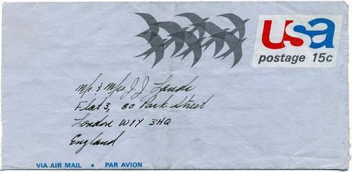 | Keywords: 1971-US-Aerogram-England.jpg en 1971 US aerogram issued to accommodate postal rate increase from 13 cents to 15 Significant error with the omission of the word AEROGRAMME which meant this technically did not meet the U P U standards and some foreign governments did not accept the lower aerogram rate After a printing of 28 million copies the same design was issued with the proper wording in December 1971 Back inscription Do not use tape or stickers to seal - No enclosures permitted 1971-05-28 U S Government aerogram; scan of original owned by the contributor United States Post Office Department PD-USGov Uploaded with UploadWizard Aerogrammes Letter sheets Postal stationery of the United States |