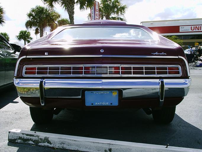 Keywords: 1972 AMC Javelin SST burgundy FLtl.jpg Rear end of a 1972 Javelin SST coupe built by American Motors Corporation AMC a pony car finished in Sparkling Burgundy paint code D8 and equipped with AMC's 360 CID 5 9 L 2-barrel V8 engine in original driver condition Note the optional front and rear vertical bumper guards own 2010-03-07 CZmarlin ” Christopher Ziemnowicz releases all rights but a photo credit would be appreciated if this image is used anywhere other than Wikipedia Please leave a note at Wikipedia http //en wikipedia org/w/index php title User_talk CZmarlin action edit section new here Thank you I the copyright holder of this work hereby release it into the public domain This applies worldwide thumb left Front end of the 1972 Javelin SST thumb center Rear view of the 1972 AMC Javelin thumb left Instrument panel in this car thumb center Head on view of a 1972 Javelin thumb left Interior front seating in the 1972 AMC Javelin SST thumb center Unrestored AMC's 360 CID engine in this 1972 Javelin thumb left Detail of the Javelin's roof with spoiler -like shape at the rear and the twin canopy vinyl roof cover AMC Javelin Rear views of automobiles |