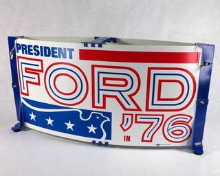 | Keywords: 1976 campaign sign.JPG en Red white and blue roof-mounted vehicle campaign sign that reads President / Ford / ™76 Used during Gerald R Ford ™s 1976 presidential campaign 2012-08-02 Gerald R Ford Presidential Museum n/a Accession Number 2006 23 Dimensions 20 5 x 39 x 5 Gerald R Ford Presidential Library and Museum-cooperation PD-USGov Uploaded with UploadWizard 1976 Campaign materials at the Gerald R Ford Presidential Museum Gerald Ford presidential campaign 1976 Political banners and signs in the United States |