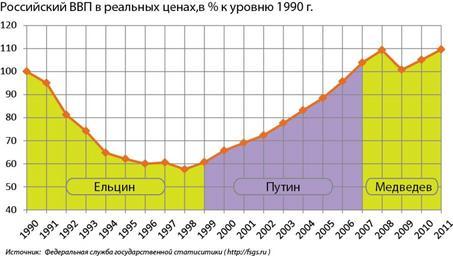 | Keywords: ВВП РФ с 1990 по 2011 гг.png disputed diagram ru ВВП РФ в еальных ценах в к у овню 1990 г согласно данным Росстата <br />1 данные за 1996-2002гг не пе есмат ивались и не сопоставимы с данными за 2003-2012 гг 2012-02-01 own Zarutskij Svyatoslav Data Note Indices of real GDP growth according to RosStat<br /> Источники <br /> С 1991 по 2000<ref>http //www gks ru/doc_2001/year01/year01 arj Российский статистический ежегодник 2001г </ref><br /> С 2000 по 2009<ref>http //www gks ru/bgd/regl/b10_13/ Российский статистический ежегодник 2010г </ref><br /> С 2010 по 2011<ref>http //www gks ru/free_doc/new_site/vvp/tab3 xls Индексы физического объема к п едыдущему году </ref><br /> wikitable style text-align right; Year Growth - 1991 95 - 1992 85 5 - 1993 91 3 - 1994 87 3 - 1995 95 9 - 1996 96 6 - 1997 100 9 - 1998 95 1 - 1999 105 4 - 2000 108 3 - 2001 105 1 - 2002 104 7 - 2003 107 3 - 2004 107 2 - 2005 106 4 - 2006 108 2 - 2007 108 5 - 2008 105 2 - 2009 92 1 - 2010 104 3 - 2011 104 3 П имечания references Economic charts of Russia Uploaded with UploadWizard |