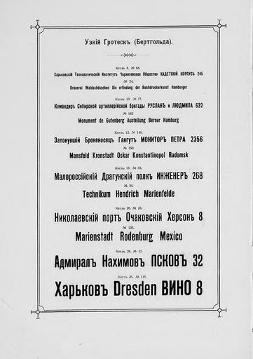 Keywords: Источник: РБГ Вильборг, А. И., типография (Петербург). Образцы шрифтов и украшений типографии А. И. Вильборга в С.-Петербурге. Русских и иностранных словолитен [Текст]. - [Санкт-Петербург : А. И. Вильборг, 19--?]. - [109] с. : ил.; 27 см. <a href="http://dlib.rsl.ru/rsl01004000000/rsl01004899000/rsl01004899879/rsl01004899879.pdf" rel="nofollow">dlib.rsl.ru/rsl01004000000/rsl01004899000/rsl01004899879/...</a> font rsl шрифт russianstatelibrary 1900е ргб полиграфия электронныйресурсргб вильборгаи