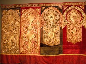 | Keywords: 19th century Moroccan ceremonial hanging.jpg en 19th century Moroccan ceremonial hanging haiti of silk velvet from Fez mid 19th century Silk velvet weave with silk supplementary warp solid velvet embroidered with metallic thread pieced Institution Indianapolis Museum of Art Paul Textile Arts Gallery object history credit line The Eliza M and Sarah L Niblack Collection accession number 1983 66 Photographed by Zambonia 2011-10-28 PD-old-100 Uploaded with UploadWizard Art of Morocco African art in the Indianapolis Museum of Art Islamic textiles |