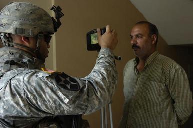 | Keywords: 1-14 Cavalry troops take over operations on Haifa Street DVIDS44171.jpg en Staff Sgt Jason Jones with Troop A 1st Squadron 14th Cavalry Regiment attached to the 2nd Brigade Combat Team 1st Cavalry Division performs a retinal scan of a resident during a mission on Baghdad's Haifa Street May 8 Apocalypse Troop Soldiers were in the area conducting a census of the local population and asking them to fill out questionnaires about the availability of essential services like water trash removal and electricity 1999-11-30 Sgt Robert Yde https //www dvidshub net/image/44171 44171 2007-05-10 13 54 BAGHDAD IQ PD-USGov 1st Cavalry Division United States Images from DoD uploaded by Fæ |