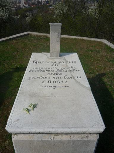 | Keywords: Братска могила 1.JPG bg Б атска могила на 26 уски войника от 7-ми пехотен Ревелски полк убити п и освобождаването на Ловеч от османско иго на 22 август 1877г Алея на Бълга о- уската д ужба хълма Ст атеш г ад Ловеч own Bulldog4eto 08 04 2010 War memorials in Bulgaria Monuments and memorials in Lovech Mass graves in Bulgaria |