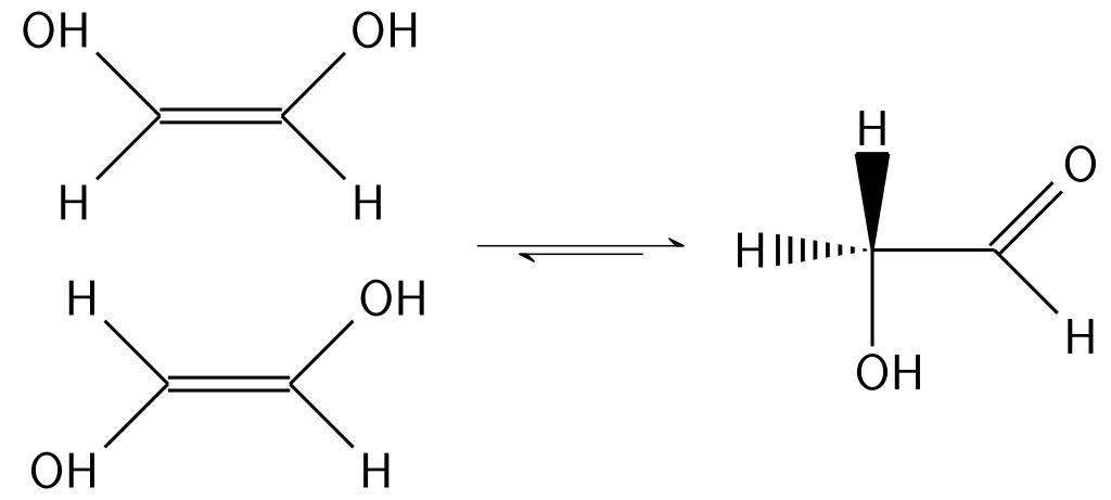 | Keywords: 1,2-ethenodiol-ethanoic hydroxyethanal.svg tautomery reaction own Krishnavedala 2014-08-01 validSVG LaTeX source code <syntaxhighlight lang latex > \documentclass12pt border 3pt standalone \usepackageT1 fontenc \usepackageutf8 inputenc \usepackage chemfig chemmacros \usepackage lmodern \usetikzlibrary decorations pathmorphing \chemsetupchemformula font-shape sf format \sffamily \renewcommand \printatom1 \ensuremath \mathsf 1 \setatomsep 2 5em \setdoublesep 6ex \setarrowdefault 1 25 \setbondstyle thick \begin document \schemestart \subscheme \chemfig OH-7 -5H -7H -1OH \arrow 0 -90 25 \chemfig H-7 -5OH -7H -1OH \arrow <->> \chemfig H> <2H -6OH - 1O -7H \schemestop \end document </syntaxhighlight> cob Tautomerism Glycolaldehyde Cc-zero |