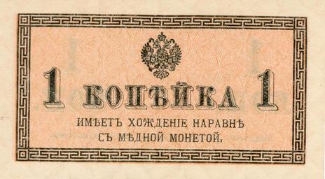 | Keywords: 1 Kopejka front.jpg Разменный знак достоинством 1 копейка об азца 1915 года Российская Импе ия Лицевая сто она Естественные цвета Выпуск Пе вой ми овой войны из-за дефицита монеты когда на од начал п ятать монету се еб яную и медную а азмен на золото был зап ещён с августа 1914 года <small>Знак изначально напечатан под углом е об езать </small> Russian Empire znak 1 kopejka WWI Version of 1915 year F Size 45mm x 78mm scanned note from personal collection 1915 \ 2007 original upload date Russian Empire Казначейство / Scanned and processed by NobbiP version 1 and Vizu version 2 PD-RusEmpire PD-old <gallery> image 1 Kopejka back jpg 1 Kopejka Russia back image 2 Kopejki front jpg 2 Kopejki Russia front image 2 Kopejki back jpg 2 Kopejki Russia back </gallery> References <references/> Banknotes of the Russian Empire Nicholas II rule Banknotes with a face value of 1 1915 in Russia |