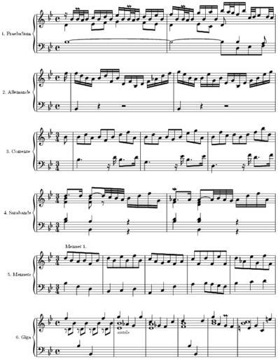 Keywords: 1-Partita-preview.png First bars of all parts of 1 partita in Clavier-Ã bung I Public domain from http //www mutopiaproject org Sheet music of Johann Sebastian Bach Suites by Johann Sebastian Bach