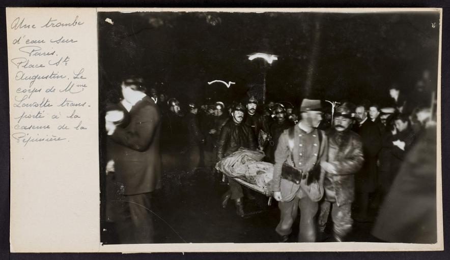 Keywords: Une trombe d'eau à Paris. Place St Augustin. Le corps de Mme Lavolte transporté à la caserne de la pépinière.