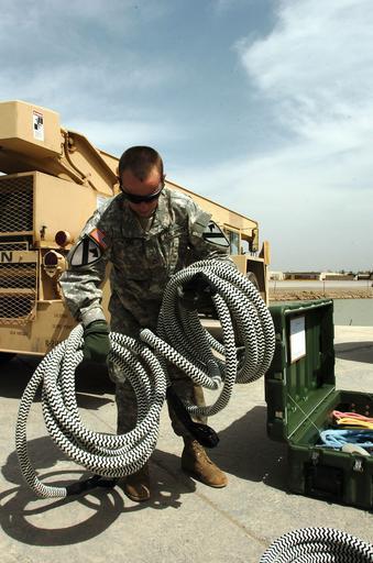 | Keywords: 1st Air Cavalry Brigade troops ready helo for haul DVIDS44550.jpg en Dayton Ten native William King a UH-60 Black Hawk repairer and crew chief for Company D 3rd Battalion 227th Aviation Regiment 1st Air Cavalry Brigade 1st Cavalry Division pulls out some ropes that go to the Unit Maintenance Aerial Recovery Kit during a practice run of sling loading a Black Hawk King along with other Soldiers in his company later implement the UMARK to transport the Black Hawk from Taji Iraq to another forward operating base for repairs 1999-11-30 Staff Sgt Nathan Hoskins https //www dvidshub net/image/44550 44550 2007-05-15 10 11 TAJI IQ PD-USGov UH-60 Black Hawk 1st Cavalry Division United States Images from DoD uploaded by Fæ |