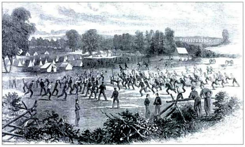 Keywords: 1st Maryland Regiment.jpg en Camp Johnson near Winchester Virgina This engraving shows the First Maryland Regiment playing football before evening parade Published in Harper's Weekly on August 31 1861 The Marylanders wear uniforms received in May and June of 1861 The Confederate Army 1861-65 6 Missouri Kentucky Maryland By Ron Field Richard Hook Author ~ 1861 PD-old Author dead more than 70 years work in public domain Maryland Militia Uncategorized 2014 January 27 |