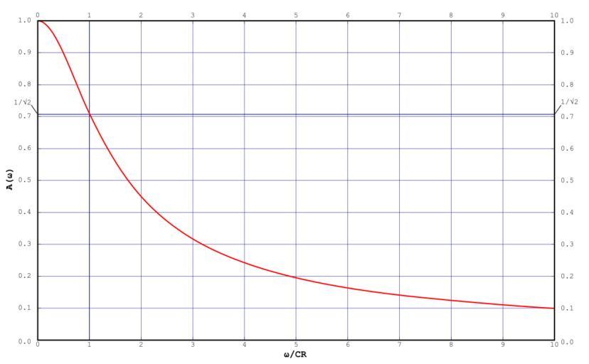 Keywords: 1st Order Lowpass Filter ARF Lin.svg The amplitude response function of the following 1st-Order Lowpass Filter centre Plotted on linear-linear scales from 0 to 10 units of RC Own drawing Plotted in Mathematica Edited in Inkscape 2007-02-17 Inductiveload Logarithmic Amplitude Response Function Linear Phase Response Function Logarithmic Phase Response Function Mathematica Source This code requires the following packages to be loaded <pre><<Graphics`Graphics`</pre> <pre> lingrid0pos1 Tablea a 0 1 0 1 ; lingrid0pos10 Tablea a 0 10 1 ; root2 1/Sqrt2 ; linxgrid lingrid0pos10; linygrid Unionlingrid0pos1 root2; ampplotlin Plot1/Sqrt1 + ω 2 ω 0 10 PlotRange -> 0 10 0 1 ImageSize -> 800 Frame -> True GridLines -> linxgrid linygrid FrameTicks -> linxgrid linygrid FrameLabel -> ω/CR A ω </pre> Analog signal processing circuit diagrams |