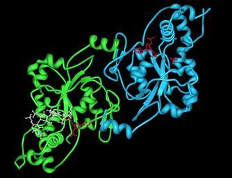 MAKE A MEME View Large Image 1T8U.jpg en Crystal Structure of human 3-O-Sulfotransferase-3 with bound PAP and tetrasaccharide substrate as discerned by Moon et al 2004 PDB 1T8U Enzyme chain A blue Enzyme chain B green PAPS red tetrasaccharide substrate white sodium ion ...