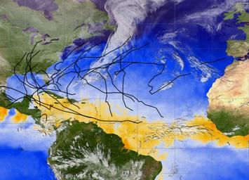 | Keywords: 2005 Atlantic Hurricane Season, Image of the Day DVIDS755746.jpg en The 2005 Atlantic Hurricane season broke record after record -- most named storms lowest pressure measured in the Atlantic longest-lived December hurricane -- and the list goes on This image provides a summary of the season with the track of each named storm marked in black In all 30 tropical depressions tropical storms and hurricanes formed in 2005 see table at the end of the article Of these 26 were named storms a status given to tropical storms and hurricanes In this image the storm tracks are laid on top of sea surface temperature measurements collected by the AMSR-E instrument on NASA's aqua nasa gov/ Aqua satellite on December 12 2005 four days after Hurricane Epsilon dissipated Though temperatures have cooled considerably compared to earlier in the season a band of warm water shown in orange still stretches across the Atlantic from Africa to the Yucatan Warm ocean waters provide fuel to developing storms and it is the cooling of the ocean that ends the hurricane season In order for a tropical cyclone to develop sea surface temperatures need to be above 28 degrees Celsius 82 Fahrenheit a threshold that is shown in orange in this image Water in the Gulf of Mexico where high temperatures fueled the season's monster storms Katrina Rita and Wilma has now cooled The relationship between sea surface temperature and storm development can be seen in the animation which shows clouds from the GOES-12 satellite over sea surface temperatures for each day of the season from June 1 to November 1 2005 The action starts in mid-June with Arlene forming off the coast of Honduras and heading northward through the Gulf of Mexico A month later powerful Emily blazes a long trail from the Atlantic through the Caribbean Sea and into the Gulf From late July to mid-August warm ocean temperatures spread farther north while storms Franklin Irene and Harvey stay out in the Atlantic far from land On August 24 Katrina appears southeast of Florida strengthening as it follows a trail of very warm waters red areas through the Gulf and leaving a path of cool temperatures blue areas in its wake One month later the eye of Rita sits over the Texas-Louisiana Gulf Coast while its outermost band of clouds brushes the southern end of Lake Michigan By October 23 the list of storm names was exhausted with Wilma brushing the tip of the Yucatan Peninsula and Alpha menacing the island of Hispaniola You can also download svs gsfc nasa gov/vis/a000000/a003200/a003279/index html high-resolution versions of the storm track animation from the Science Visualization Studio The storms are summarized chronologically in the following table Storm information in the table is from UNISYS' weather unisys com/hurricane/atlantic/2005/ 2005 Hurricane/Tropical Data for the Atlantic Images and captions for most of these storms are available in the Natural Hazards section of the Earth Observatory and can be viewed by clicking on the storm name Because storms 10 19 22 and 27 were tropical depressions they are not included in the image 2011-07-06 https //www dvidshub net/image/755746 755746 2012-10-19 16 53 WASHINGTON DC US PD-USGov Lake Michigan Images from DoD uploaded by Fæ |